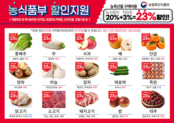 "국산 농축산물 최대 23% 할인 혜택 받으세요"